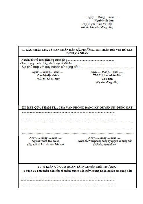 * Hướng dẫn viết đơn: Tên người sử dụng đất: đối với cá nhân ghi rõ họ, tên, năm sinh, số giấy CMND, ngày và nơi cấp giấy CMND; đối với người Việt Nam định cư ở nước ngoài và cá nhân nước ngoài ghi họ, tên, năm sinh, số hộ chiếu, ngày và nơi cấp hộ chiếu, quốc tịch; đối với hộ gia đình ghi chữ “Hộ ông/bà” và ghi họ, tên, năm sinh, số giấy CMND, ngày và nơi cấp giấy CMND của chủ hộ, số và ngày cấp sổ hộ khẩu; trường hợp quyền sử dụng đất là tài sản chung của cả vợ và chồng thì ghi họ, tên, năm sinh, số giấy CMND, ngày và nơi cấp giấy CMND của vợ và của chồng; đối với tổ chức thì ghi tên tổ chức, ngày tháng năm thành lập, số và ngày, cơ quan ký quyết định thành lập hoặc số giấy đăng ký kinh doanh, giấy phép đầu tư của cơ quan nhà nước có thẩm quyền cấp.- Điểm 2.5 ghi mục đích sử dụng đất theo quyết định giao đất, cho thuê đất, chuyển mục đích sử dụng đất của cơ quan có thẩm quyền cấp; trường hợp không có quyết định giao đất, cho thuê đất, chuyển mục đích sử dụng đất thì ghi theo hiện trạng đang sử dụng;