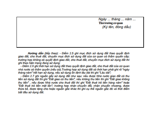 - Điểm 2.6 ghi thời hạn sử dụng đất theo quyết định giao đất, cho thuê đất của cơ quan nhà nước có thẩm quyền (nếu có).Trường hợp sử dụng đất có thời hạn phải ghi rõ “ngày tháng năm” hết hạn sử dụng, nếu sử dụng ổn định lâu dài thì ghi “Lâu dài”;